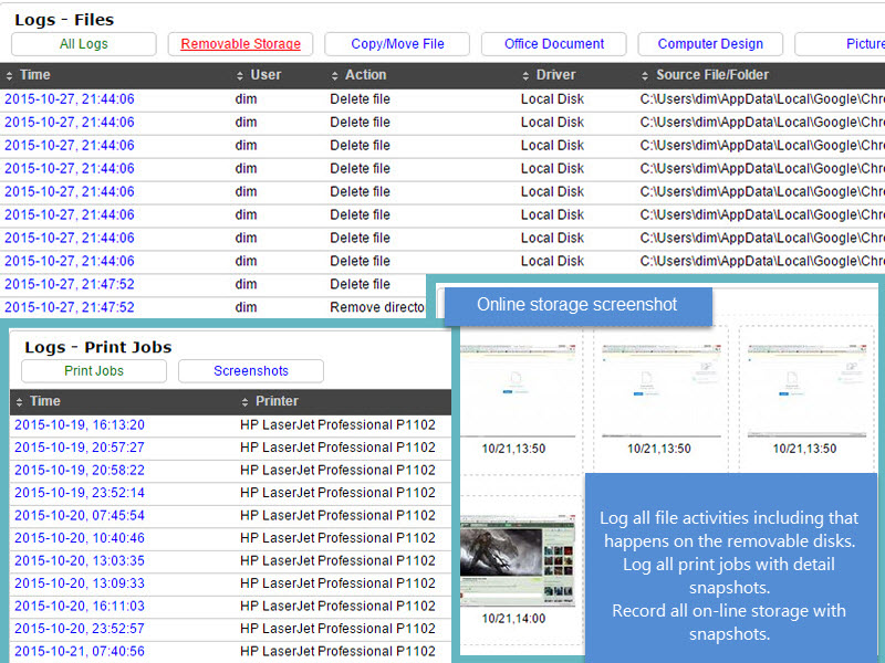 Keystrokes Screenshots Clipboard Keystrokes typed Print jobs File operations USB Device usage System Events Clipboard Agent Alerts Application usage